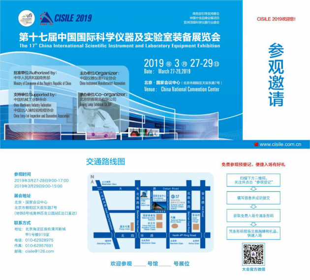 以国际展览业协会(UFI)认证为起点,闪耀世界科学仪器展览细分板块;以展商16年连续参展这一事实,为参展效果背书;以不断升级的服务体验,为科学仪器及实验室装备行业发展提供助力,第十七届中国国际科学仪器及实验室装备展览会(CISILE 2019)再次向您提出特别邀请。诚邀您于2019年3月27-29日,光临北京·国家会议中心,参加第十七届中国国际科学仪器及实验室装备展览会(CISILE 2019)。我们不见不散!