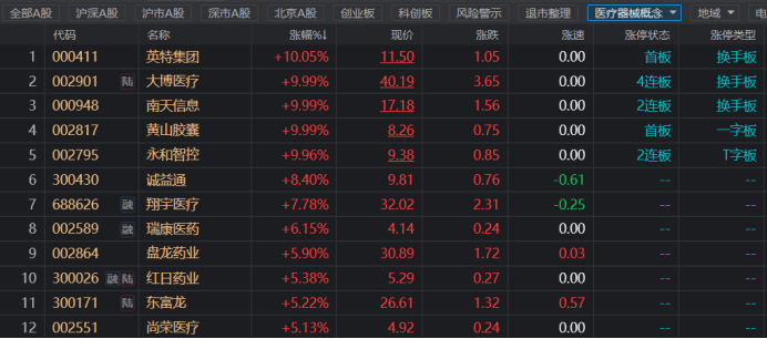 财联社(上海,编辑 梓隆)讯,今日(9月30日)早盘,医疗器械概念继续活跃,个股掀起小涨停潮,截止午间收盘,英特集团(000411)、大博医疗(002901)、南天信息(000948)、黄山胶囊(002817)、永和智控(002795)涨停。其中,大博医疗晋级4连板,成为两市次高标,南天信息、永和智控则均获2连板。