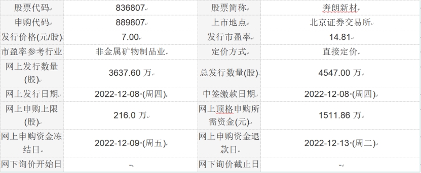 2022年12月5日,奔朗新材披露的向不特定合格投资者公开发行股票并在北京证券交易所上市发行公告显示,若本次发行成功,超额配售选择权行使前,预计公司募集资金总额为31,829.00万元,扣除发行费用3,576.84万元(不含增值税)后,预计募集资金净额为28,252.16万元;若超额配售选择权全额行使,预计公司募集资金总额为36,603.35万元,扣除发行费用3,805.18万元(不含增值税),预计募集资金净额为32,798.17万元。